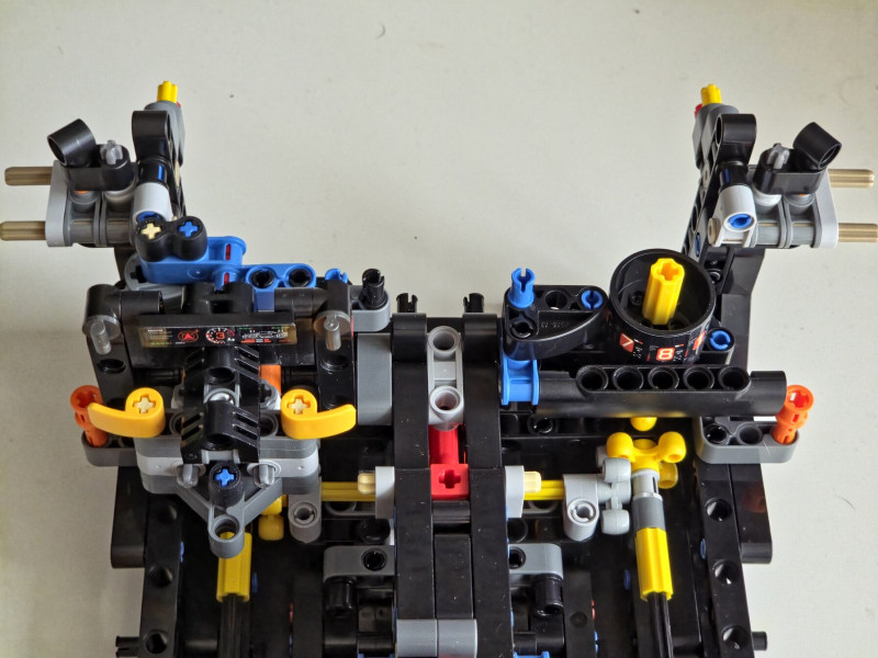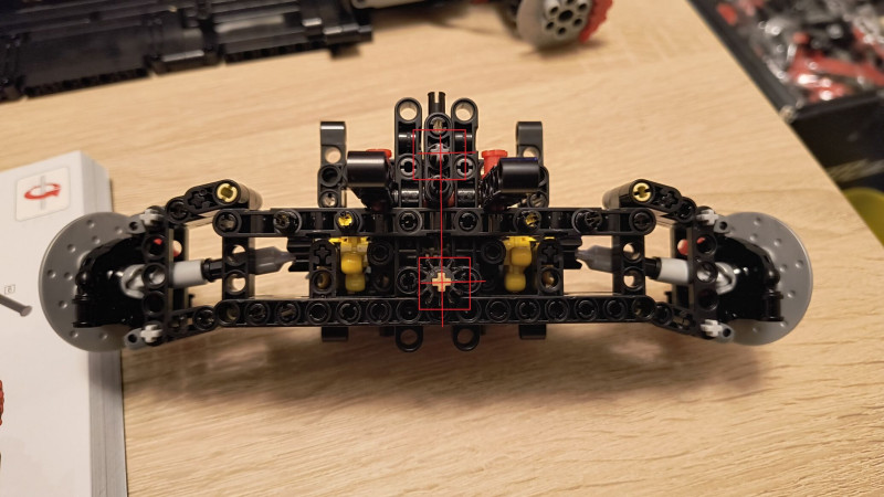 Van egy hiba az összerakási útmutatóban is, de szerencsére nem vészes hibáról van szó. A B140-es lépésnél azt mutatja, hogy a két oldalsó fogaskeréknek kell egyformán állnia, ami igaz is, viszont az kimaradt, hogy a középső két tengelynek is síkban kell lennie, máskülönben a felfüggesztés nem fog szinkronban működni. Bejelöltem az egyik képen, mire kell itt figyelni.