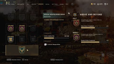 Említik, hogy bugos a Heroic Weapon Bribe, amihez volt a napokban egy 100 multi meccses Special Order, de aztán kivették. Van még valaki, aki akkor felvette? Nem tudom, érdemes-e így foglalkozni vele, gyűjtögetni a meccsek számát, aztán ha visszakerül, annyival is előrébb lennék. Másrészt viszont ki tudja, mikor kerül vissza, ha egyáltalán...