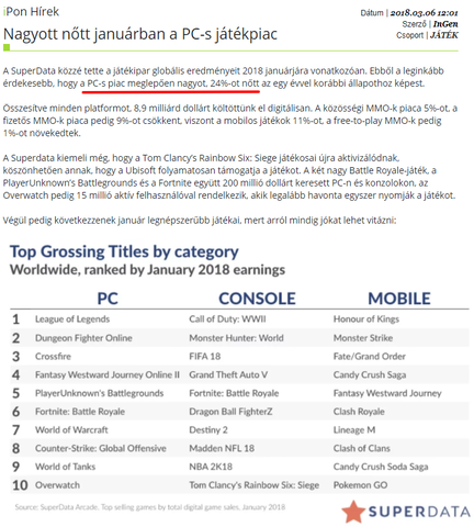 Nekem úgy tűnik, hogy a játékgyártók és a hardvergyártók kartele meg fogja ölni ezt a pc-s piacot. Ma már egy modern játékhoz közel félmilliós periféria szükséges. A mai Magyarországon ezt igen kevés háztartás engedheti meg magának, ezért a konzol piac erősödik. A játékok pc-re túlárazottak és indokolatlanul magas hardverigényűek. Ha összehasonlítjuk egy Black Ops II grafikáját a WWII-vel semmi nem indokolja ezt a túlzást.