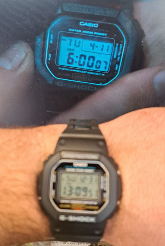 Azóta sikerült megnézni a dw 5600BB-t is és a sima 5600-ast is. Csuklómon az 5600BB kissebbnek hatott, bár tudom hogy a mérete ugyanaz mindkettőnek.Itthon már van egy GA 2100 1aer, azt is nagyon szeretem. Nem tudom hogy abban a kis digitális kijelző mennyire hasonlít avagy külömbözik az 5600BB negatív számlapjához. Illetve hogy a fekete kijelzőn nem e látszódna meg jobban a későbbi karc vagy sérülés az 5600bb esetén ?