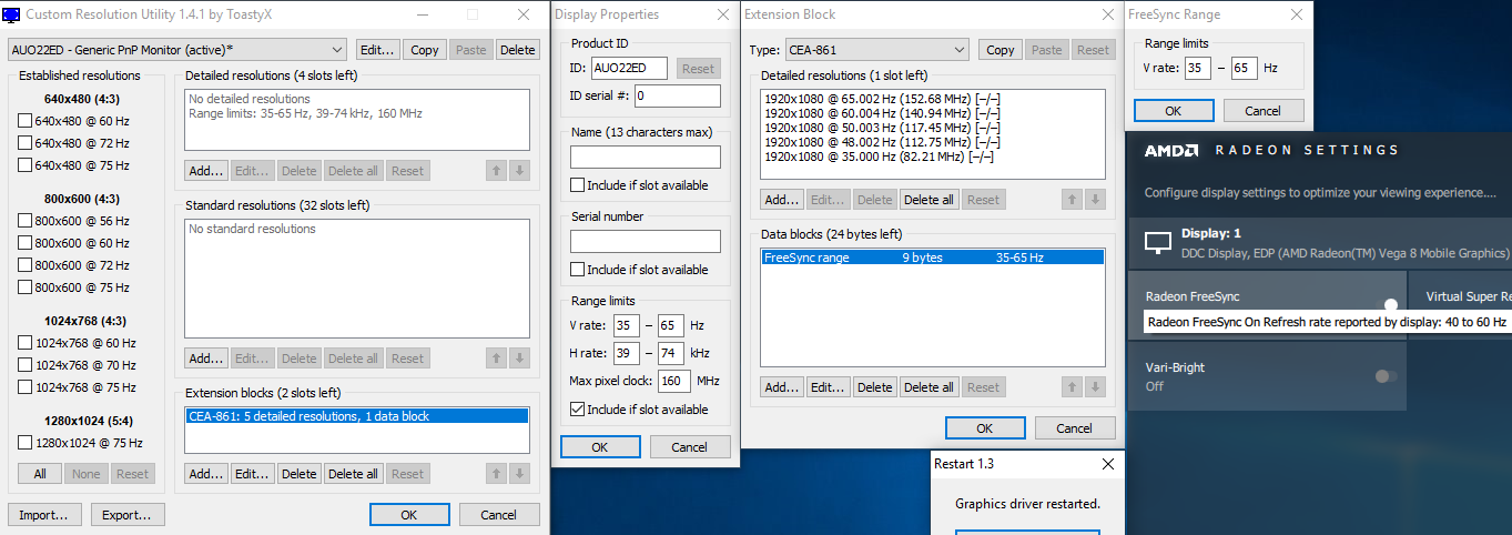 Mondjuk annyira nem lep meg, mert az eredeti 40-60 számokat sehol sem látja a CRU az EDID-ben. Honnan olvassa ezt ilyenkor ezekről az eDP-s kijelzőkről a driver? Esetleg külön, saját adatbázisa van az AMD driver-nek ilyen noti kijelzőkre?