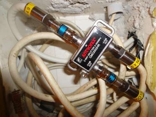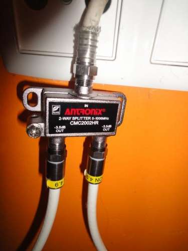 A kábel végén lévő sárga csík az F csatlakozó, az első képen ahol az első kettes osztó van, ott az osztó in és az egyik out kimenetén van csillapító, kék alapon FAM felirat. Mindkettőre rá van írva egy szám dB-vel. Azt kellene megnézni hogy hányas szám van ráírva és azt is jó lenne tudni hogy az osztó után kötött csillapító kábele a második osztóhoz vezet-e vagy sem.