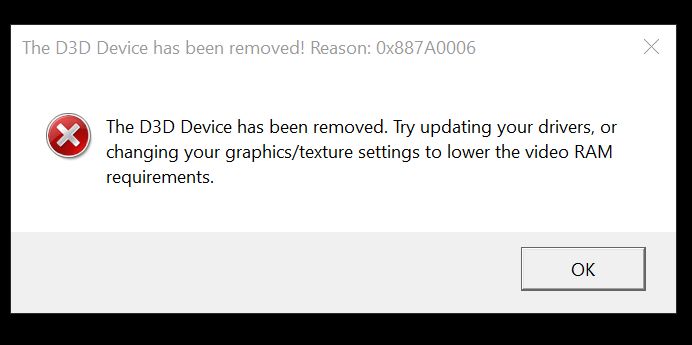 A D3D készüléket eltávolították! OK: 0x887A0006 A D3D eszközt eltávolították. Próbálja frissíteni az illesztőprogramokat, vagy módosíthatja a grafikus/textúra beállításait a videó ram követelményeinek csökkentéséhez. Rendben.