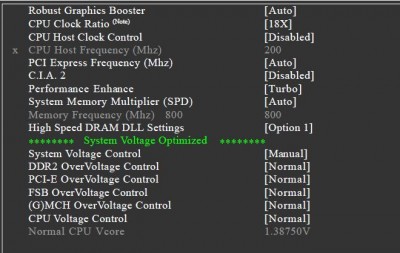 Nem még a régi van fenn, megnéztem a TM2 kikapcsolásával megy 9×200on, azaz 1,8Ghz-en, de ha feljebb emelem az FSB-t akár eggyel is már a biosképernyő után újraindítja a gépet és visszaállítja a CPU host controll-t disabled-re, azaz alapra... Ha viszont a TM2 be van kapcsolva, akkor emelhetem az FSB-t nem indítja újból a gépet a következőő bootnál lévő biosképernyő után, de a biosba leveszi 6-osra a szorzót.... Ez a gigabyte-nak vmi védelmi funkciója h visszateszi alapra??