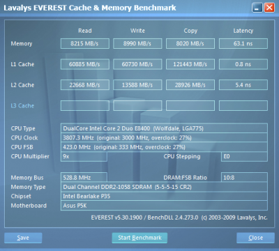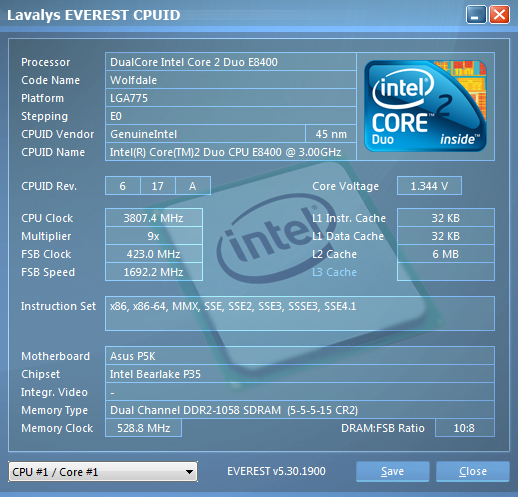 CPU típusa DualCore Intel Core 2 Duo E8400, 3800 MHz (9 x 422)