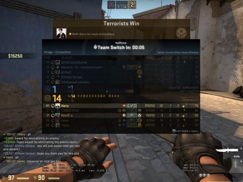 Full random a szerver. Múltkor társam halott volt, és pont végignézte ahogy az m4-et beleraktam a csávó oldalába, egy tárat belelőttem, majd az rámfordult és fejbe lőtt. Effektíve a bordái közé beékelődött a fegyver hangtompítója és 94 in 4. Ezen nem volt mit magyarázni. Egy kis hatásszünet, majd röhögtünk egyet TS-en. Ennyire egyértelmű szerver fail még nem volt, pedig összesen kb. 1500 győzelmem van MM-ben, ami kb. 3000 lejátszott meccsnek felel meg.