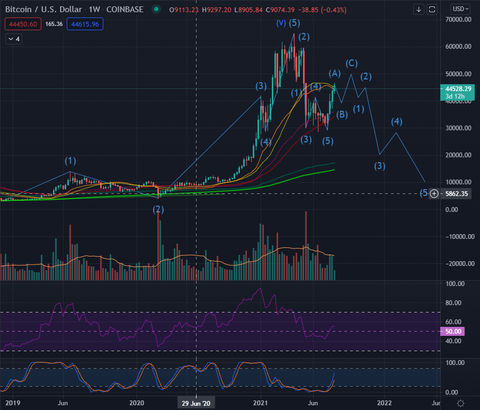 Amit (5) nek beirtal csucs az sztem emiatt meg csak a 3-as hullam csucsa, es onnan folytatolag szamozva (4) a kovi alj, es igy tovabb lesz egy 5-os 50K kornyekere -