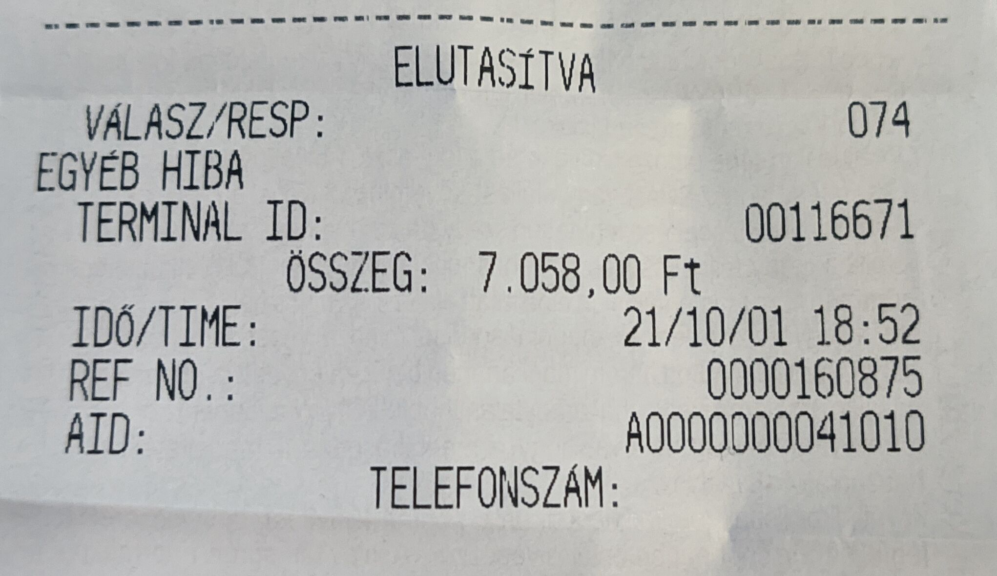 1.) 2021.10.01 a győri Auchanban, "074 egyéb hibával" sikerült zároljon a mögé betett OTP számlán 7058 Forintot. Ezt azóta is várom hogy feloldják, lassan letelik a 2 hét. Vicces, hogy olyannyira megzavarta a terminált, hogy egyből le is fagyott, hard resettel lehetett újraindítani, távolról nem is látták.