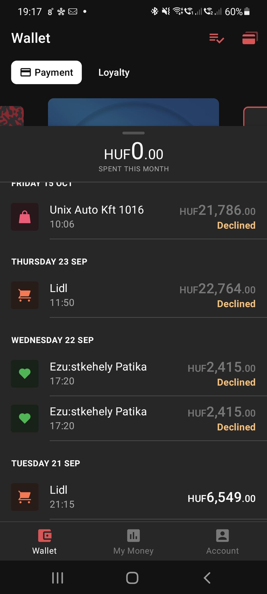 Az alap kártyám egy Visa, Anti Embarrassment-ben be van állítva a Cetelem HK, reggel Lidl fizetésnél 5x elutasította a vásárlást fedezethiány miatt. A Visa-n nincs pénz de ott van a Cetelem beállítva ilyen esetre. Appban nem tudtam váltani, hogy a cetelem legyen az elsődleges kártya, mert sajnos valamiért épületen belül csak edge a mobilnet. Lehet, hogy a mobilnet miatt nem ment az anti emb. mód?