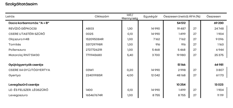 Nekem 3,5 éve kb. 70.000-ért csinálták meg az általam kért olajcserét. 3000km utan kértem egy olajcserét biztos ami biztos alapon, és tényleg csak az olaj meg a szűrő volt benne. Ehhez képest az rlső tétel nem sok. A többi viszont húzósnak tűnik nagyon.