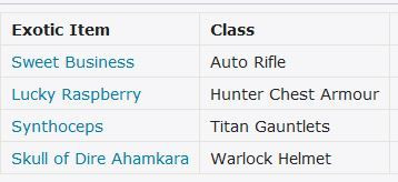 Antiope-D, Curtain Call, Nameless Midnight, Uriels Gift, Valakadyn, Origin Story, Better Devils, The Number, Hawthorne's Field-Forged Shotgun, Last Hope, Jiangshi AR4, Manannan SR4, Martyr's Make és bármelyik, amelyik a Leviathan-ból esik (fehér-arany színe van mindnek). -