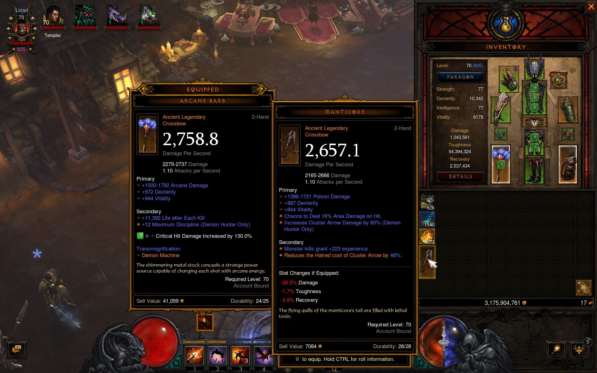 Szerintem vagy csinalj belole ancit. 50FS +5 bounty mati minden actbol egy forgatas ara. Vagy pedig ugye sarga crossbow-bol egy ujat. Jobban lehet vele spammelni a Cluster Arrow-t, ami ugye a fo dps-t adja M6-nal. Nem tudom milyen jo a bracer-ed(gondolom anci), de elvileg mindegyik DH-nak a Wraps Of Clarity az egyik legjobb mar. (ebben persze tevedhetek, de valahogy mindenhol csak azt latom)