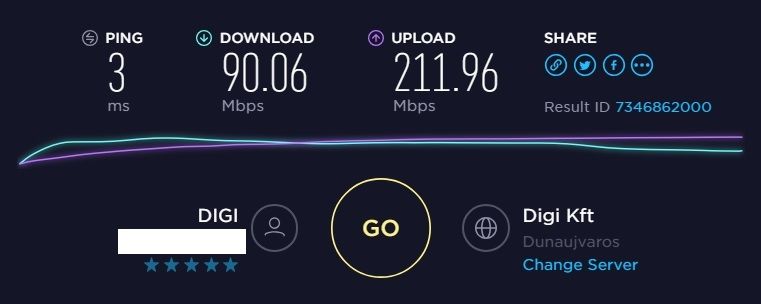 http://digi.speedtestcustom.com/result/d1e8f640-619f-11e8-8f7c-4b550553a287Amikor a router-t bypassoltam, akkor először közel 10x-re nőtt a sebesség. Legutóbb, pár változtatásoknak köszönhetően, elértem a 250 Mbps-t, a routert kihagyva. Digi 500-as net-re upgradeltem. A gigabites router még úton van, tehát nem is várok el 100 Mbps-nél nagyobb sebességet addig a jelenlegi routerre csatlakozva.