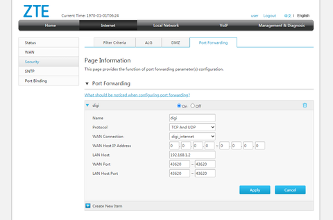Ma FTTH-sített a Digi. Az eszköz, amit kaptam egy ZTE ZXHN F618V2. A port forwardot sikerült megoldanom egy kis bénázással full amatőrként, eddig router-mentes életet éltem. (A felülete 192.168.1.1-en érhető el, viszont a port forwardnál a 192.16.1.2-t kellett beírni.)