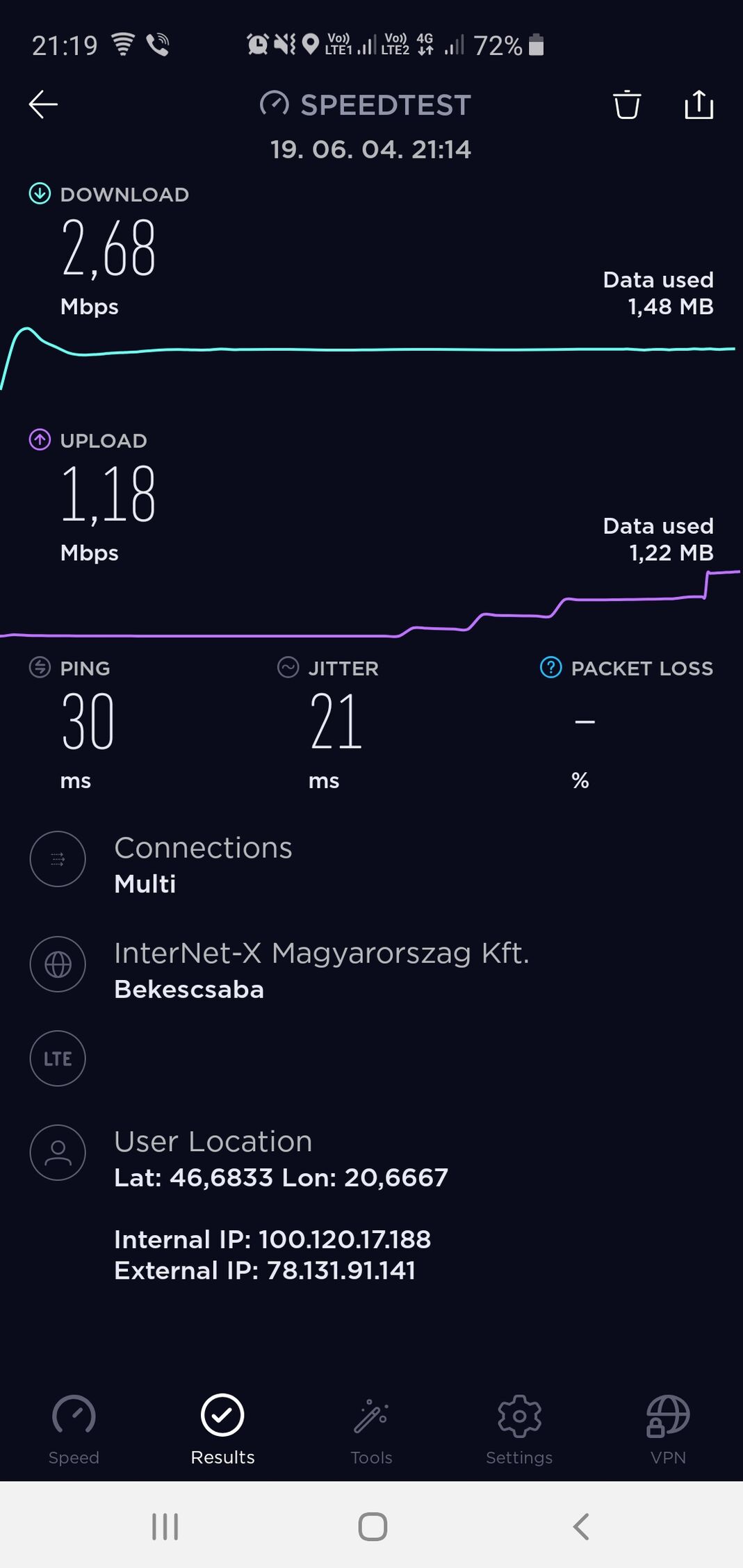 Sajnos csak kb. 1.71 Megabit le, és 1.45/0.78 Megabit fel. Sajnos nem tud 4G-n telefonálni, átvált 2G-re.