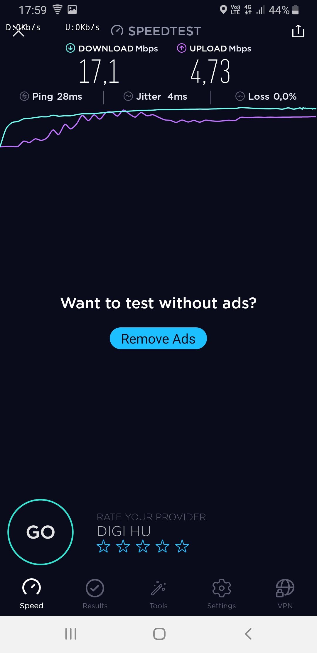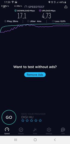 Debrecen MyBox Mikepércsi ut Digi 12/5 Mbit, Telenor 1/0,5 Mbit mindkettő boltban mérve.