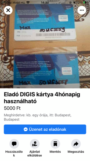 A Facebook napról napra dobja elém a marketplace hirdetéseket, amiben Digi SIM-eket kínálnak "korlátlan net és telefon" felkiáltással 3-7e közötti áron. Mindig elgondolkodom, tudtommal csak előfizetések vannak. És miért 3-4 hónapig használható? Ezt mégis hogy???(Van egy elméletem, abból kiindulva, hogy minden hirdetést különösen kedvesnek látszó, éppen integrálódó polgártársak jegyzik... :/ : Valaki nevére kihozzák, talán nem is tud róla. Eladják, 3-4 hónapig megy, de mivel nem fizetik, Digi kikapcsolja. )