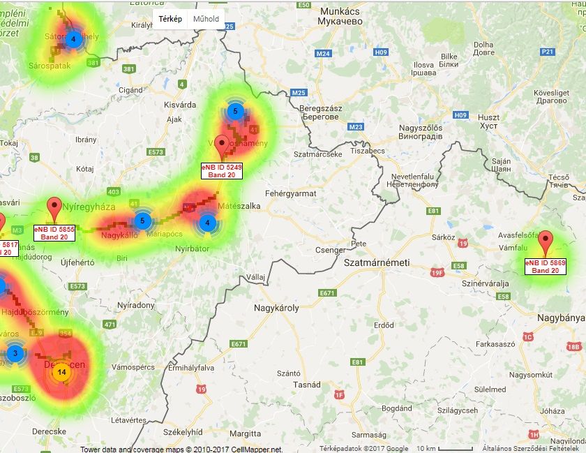 Azért azt jegyezzük meg, hogy ez a "háromszögelés" nem egészen az, amit a neve sejtet. Mivel a szoftver a TA-t nem tudja kiszedni a telefonból (~78 méter a felbontása LTE-n), ezért semmi mást nem csinál, mint a mért jelszint és a rögzített koordináták alapján becsül. Ez még ideális esetben sem pontos, és minél kevesebb a mérési pont annál pontatlanabb. A látottak alapján több száz métert tévedhet a mérés.