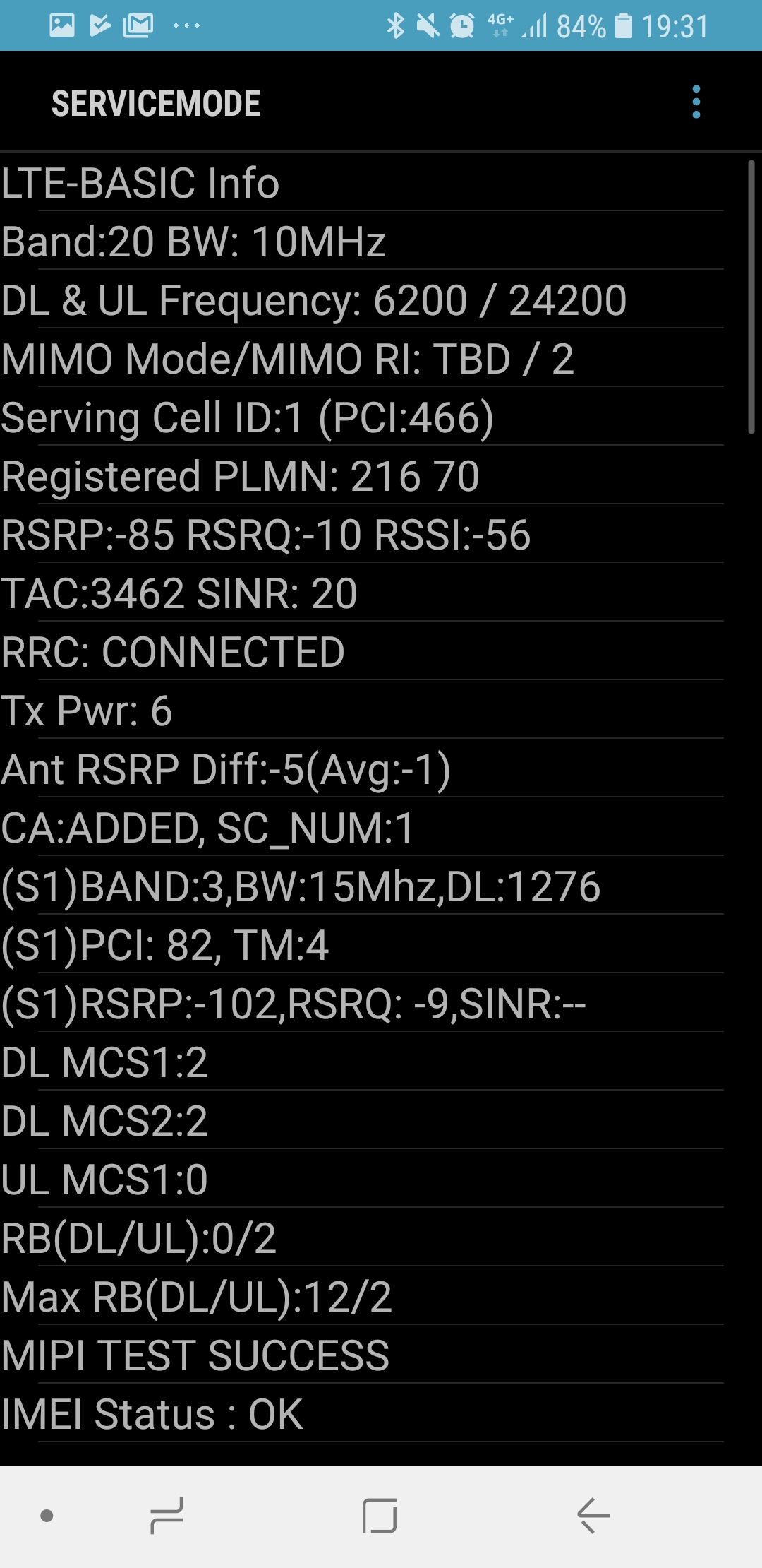 A másdik képed pedig trükkös, mivel a laikus szemlélőnek úgy tűnik, mintha lenne vivő aggregaáció lefelé, valójában persze nincs, mivel a másodlagos vivő RSRP-je túl alacsony. Ezért sincs a SINR mellett érték (mivel azt csak a telefon számára kiallokált RB-ken méri a teló, és ha az állomás nem ütemez semmit, nincs is mit megmérnie). Szóval ezt te simán 800-on mérted, aggregálás (4G+) nélkül. És annak oké. Nem mondom, hogy fasza, de erős közepesnek elmegy.