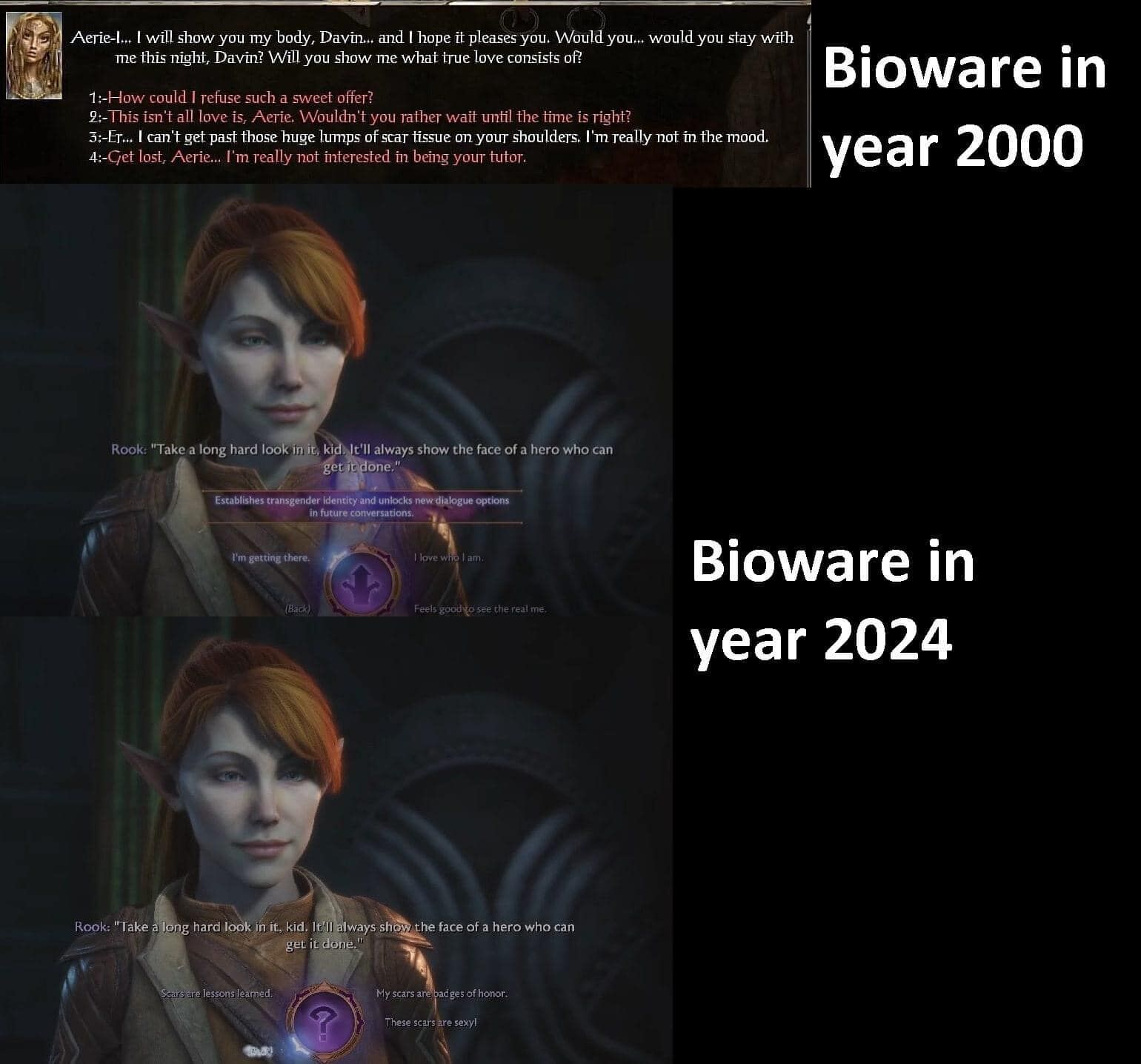 Ma meg: legyen benne non binary, meleg, transz, műtéti hegek, meg még ki tudja mi. Ja játék is kell? Legyen valami könnyen leprogramozható, kevés és bugyuta szöveggel. Ez a DA: Veilguard.