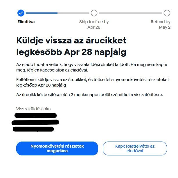 Ennek ellenére kaptam az Ebay szerint egy visszaküldési címkét az eladótól, két lehetőségem van csak: nyomonkövetési részleteket megadni, valamint felvenni a kapcsolatot az eladóval.