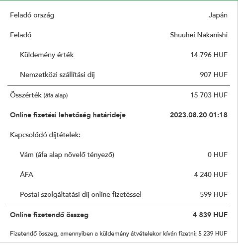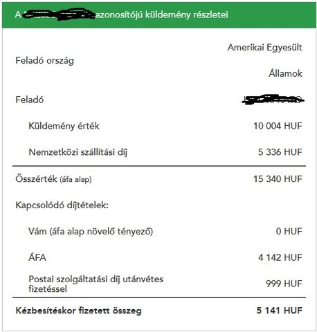 De akkor röviden, hiába vámmentes 150 €-ig az nem változott hogy vám-árunyilatkozatot kell beadni a vám felé az ilyen küldeményekre. A Magyar Posta ezért a tevékenységért kér szolgáltatási díjat, ez lehet ha megkpják az online elérhetőséget 399 Ft vagy ha nincs elérhetőség akkor utávlétes kézbesítés és 799 Ft. Ez ha IOSS rendszerű a vásárlás az adott csomag értékétől függetelen fix díj. Már 2 év és 1 hónapja ez van. -