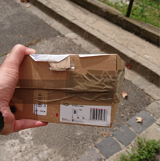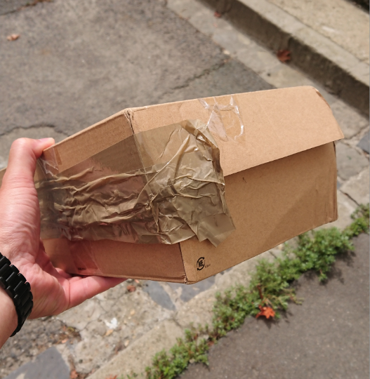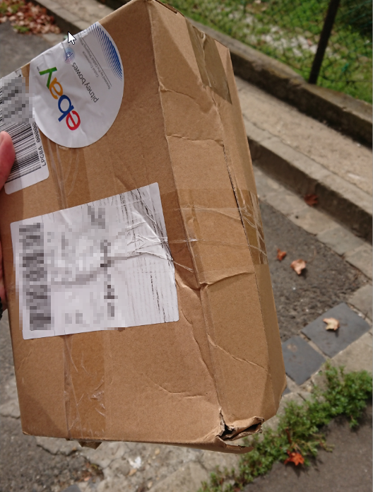 egy karton doboz pitney bowes matricaval es az egesz mint amin tapostak (raadasul valami valami papucsos doboza atpakolva), ragasztoszalag alig volt rajta az is letepkevde.