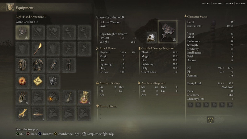 Valahogy összeszedtem kettő Troll Knight's Swordot. Poén lenne dupla kolosszális fegyverrel nyomulni, csak a 20-as erő követelmény a harcos-varázslómnak nem fog összejönni.