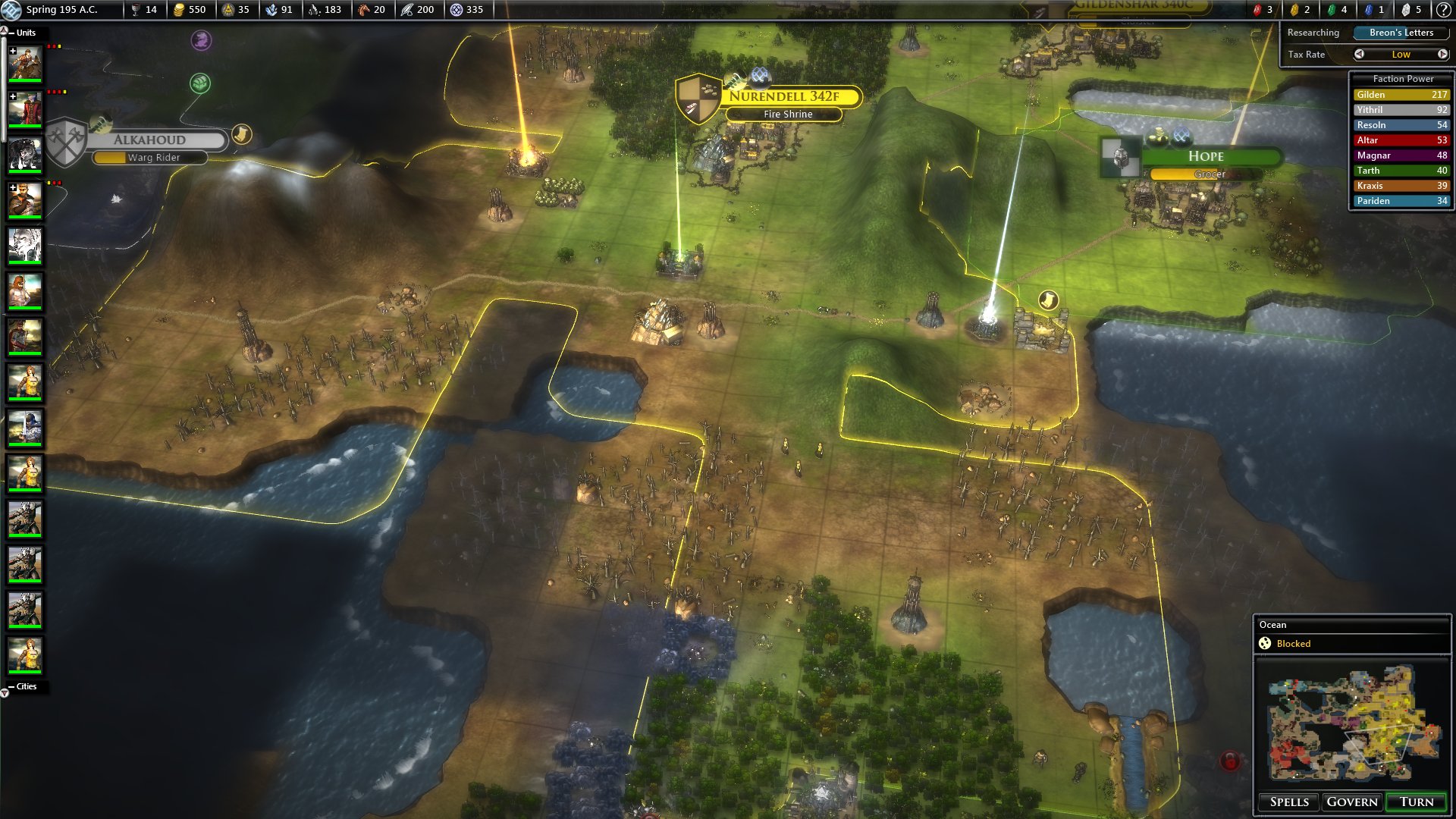 Én új játékba kezdtem, small map, Normal, a szörnyek viszont Easy. Összesen hárman vagyunk, bár Gilden, ahogy látom, már nem sokáig. Yithrill nagyon megizmosodott, és a foreign relations szerint háborúban állnak. Gilden már könyörgött nekem, adjak neki valamit támogatás gyanánt. Nem adtam végül.