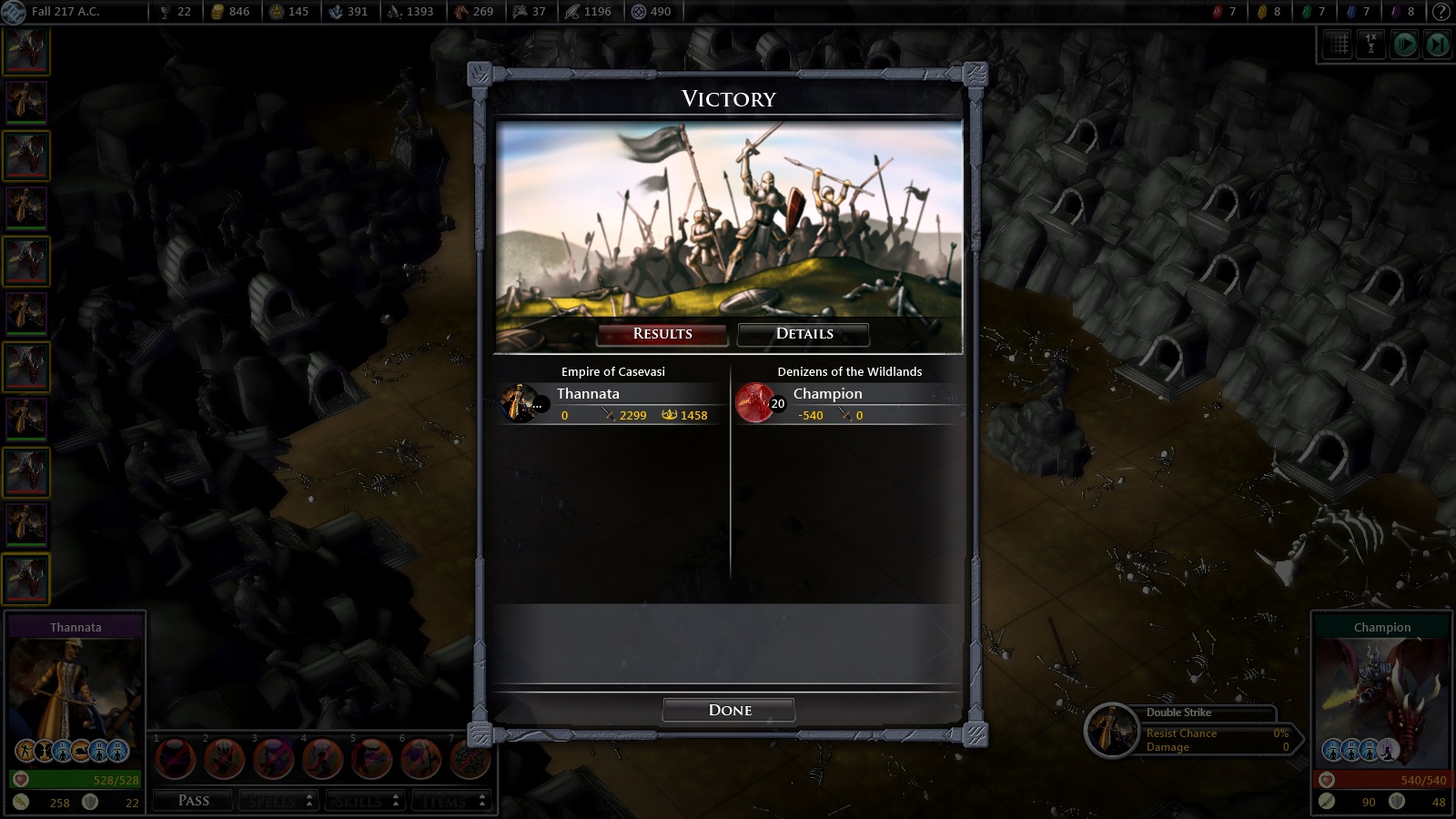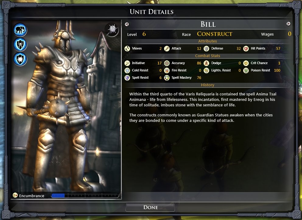 Én tegnap befejeztem a legutóbbi játékom. Vesztettem volna, de nem vittem végig. Yithrill engem is megtámadott, szépen foglalgatta el a városaim. Végül már csak a fővárosom maradt, azt meg nem akarta lerohanni. Visszavettem egy városom, amit persze védelem nélkül hagyott. Aztán megtámadott ott a fő seregével. Hagytam auto resolve-ra, mert bár mind az öt hősöm ott volt, valamennyien elég alacsony életponttal a korábbi veszteségek miatt, tehát biztos voltam benne, hogy alulmaradok a csatában. Erre kihozta nekem, hogy győztem. Tény, hogy majdnem mindegyik megint ment az újraélesztőbe, de akkor is, kétlem, hogy legyőztem volna a csapatát, ah manuálisan nyomom.