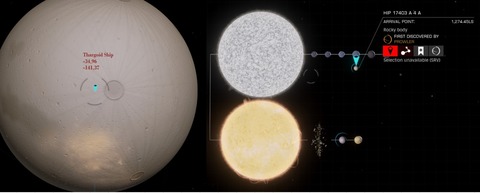 Viszont amit írtam hogy ezek a Tourist Beacon-ok csak olyan bolygók mellett találhatók ahova nem lehet leszállni ez nem igaz, mert ma volt két olyan beacon is ami egy-egy hold felszínén volt. Nem kellett leszállni, csak jó közel menni hozzá, scan, és ennyi.Aztán, a visszafelé úton ebbe majdnem beleestem: