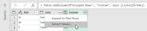 6. Kattints az új oszlop jobb felső sarkában lévő ikonra, és válaszd az Értékek kinyerése opciót. A megjelenő ablakban válassz egy elválasztó karaktert, én a kettőspontot használtam most.
