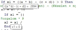 End SubA problémám az, hogy az x1 változónak kéne felvenni a kalkulát rendelés eredményét, mert tovább kellene vele még számolnom, de az mindig 0 értéket vesz fel. Azért nem értem, mert ha ráviszem az egerem a szorzatra, akkor látszik, hogy mindent jól számol ki: