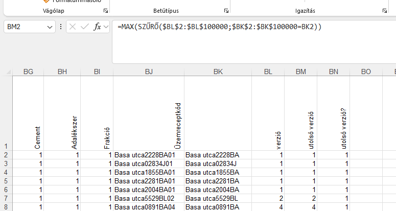 A jelenlegi megoldásom tökéletesen működik. Szétvágom a receptszámot és a verziót. A BM oszlopban egy, a verzió nélküli receptszámra beállított szűrővel és egy MAX-al megkapom, hogy az adott sorban szereplő recepthez mi a legnagyobb receptszám, és ezt hasonlítom a BN-ben össze a sorból kiolvasott verziószámmal.