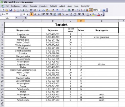 M11-590-029/017 118 4530498833 Welle 8-109-271-765 1A másik munkalapon tartalékok szerepelnek, a következő formában: