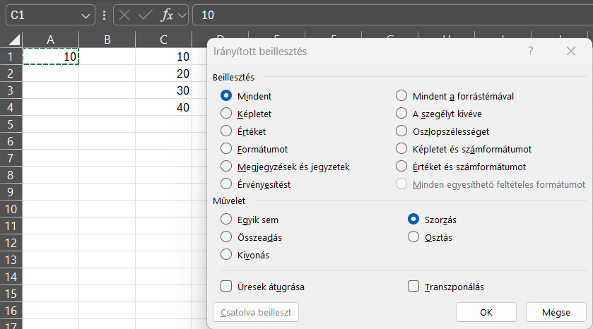 Ezután A1 cella értékét változtatom 10-re. Eredmény: