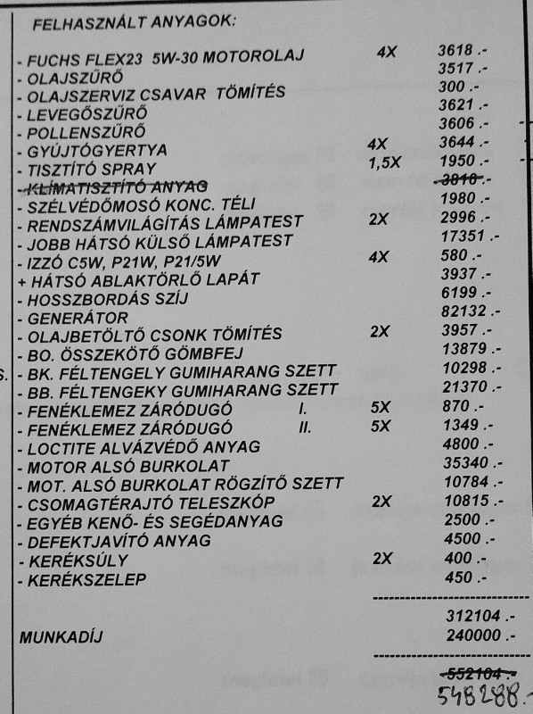 Szerintem 1 éve volt hasonló, akkor volt olajcsere periódus, meg előtte ugye akadt olyan is amit az előző szerelő gányolásai után rendbe kellett tenni. De legalább kipróbáltam, hogy mi van ha alternatív helyre viszem vagy megpróbálom vinni. Így már erre is van összehasonlítási alap az Ekcel táblázatban, bár nem tudom, hogy merrefelé lehet súlyozni ha futómű és fék hibájával kaptam vissza a kocsit, szervóra meg valami 250ezreskedvezményes baráti ajánlatot úgy, hogy igazából semmi baja nem volt. De legalább erőből oldottak meg egy csomó mindent és elfeszegették a vízpunepát, az sem volt vicces.
