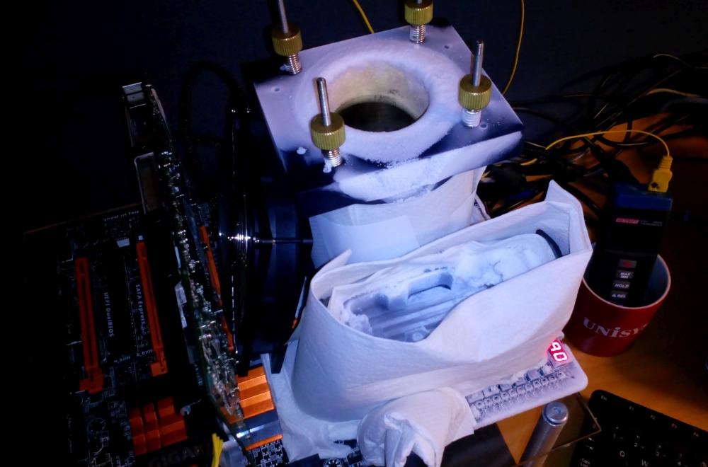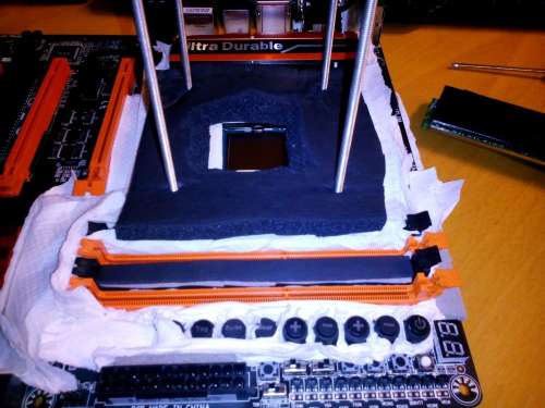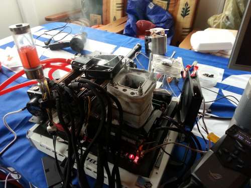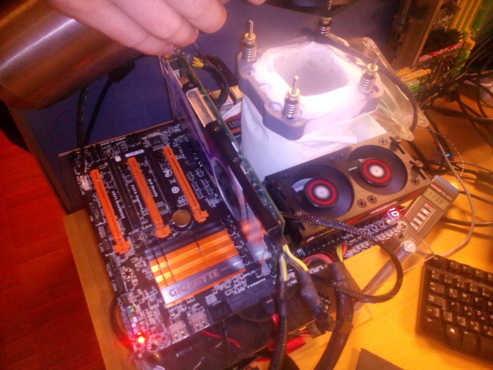 Így jutottunk el oda hogy az eddigre már kiszáradt,( és Cosmo által alaposan beszigetelt,majd tőle megvett) P5E3 premium a nap folyamán másodjára került hidegre. Sebtében összedobott szigeteléssel,4-6 liter nitrogénnel futottam neki a sztorinak,majd mikor látszott hogy van remény,zene maximumra az ipodon,és PADLÓGÁZ!