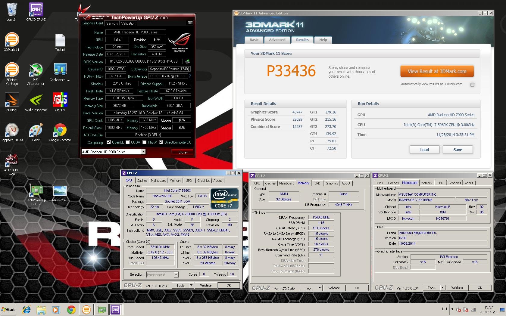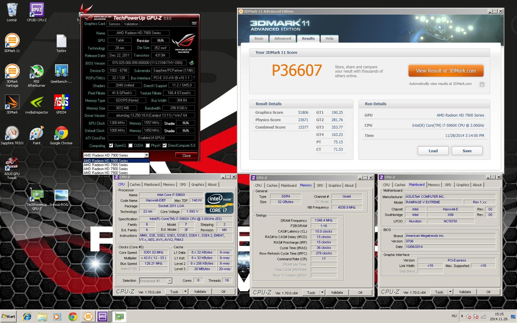 A konfiguráció: asus R5E, 5960X cpu, 32Gb Crucial DDR4 ram, Samsung EVO 120Gb ssd,Corsair AX 1200W psu, valamint chillerrel hűtött 4 db HD 7970 cfx.A videó kártyák túlhajthatóságát illetően nem voltak kétségeim, ezek már jó pár alkalommal bizonyították, hogy 1300MHZ-en stabilak tudnak lenni kellően behűtött vízzel.