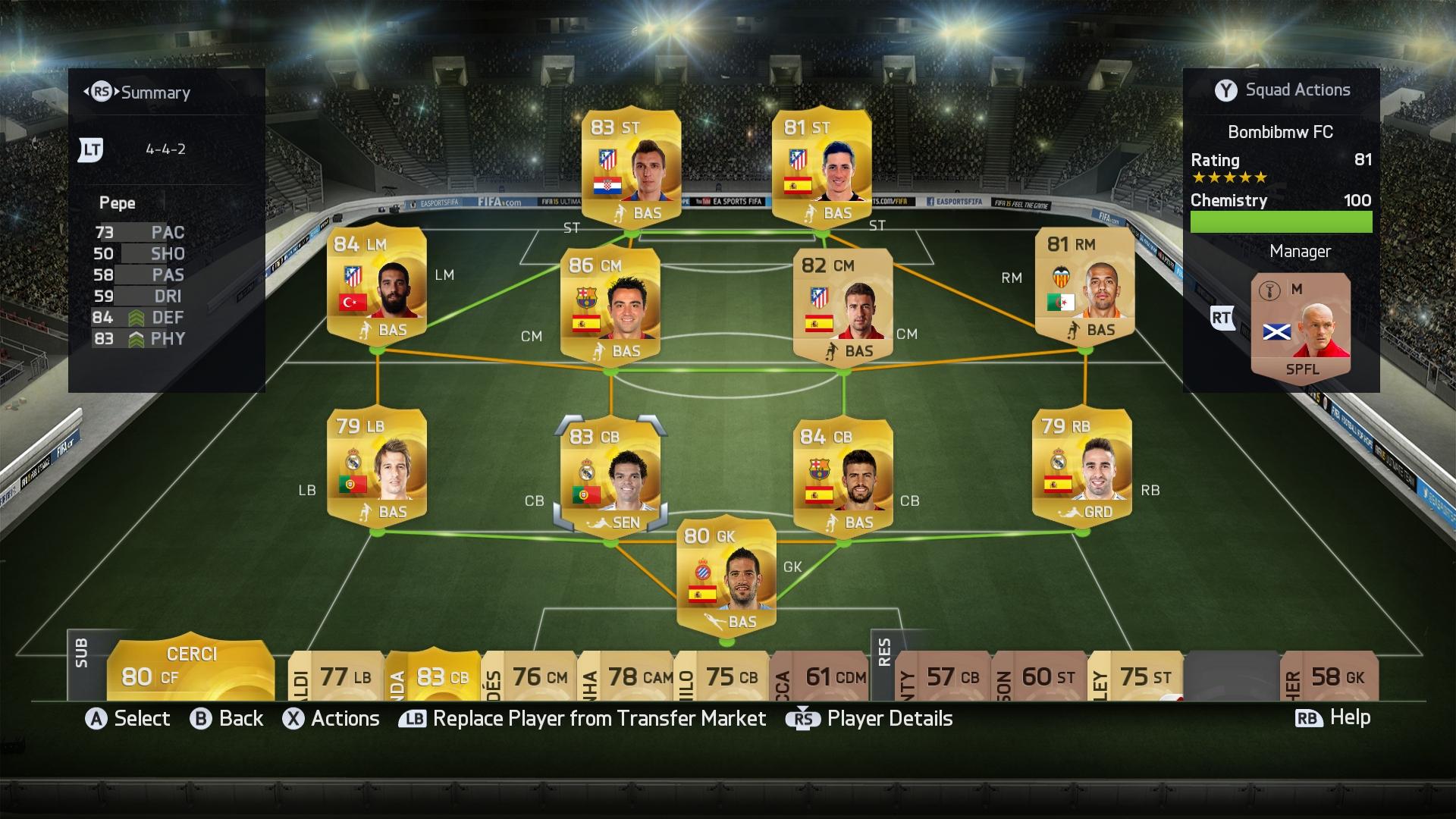 na, a helyzet az, hogy adom is el a BPL felét, ez a felállás abszolút nem játszható számomra. a középpálya se nem elől, se nem hátul van, Cabella, a kreatív, agilis CAM-em belevész a mezőnybe, túl nagy területet kell befutnia/átcseleznie, Paulinho jól passzol, de az a 80-as defending stat egy hazugság, és túl sokszor out of position. Luis nem elég erős, Cahillel meg voltam elégedve, Cech pedig első osztályú, csak drága.
