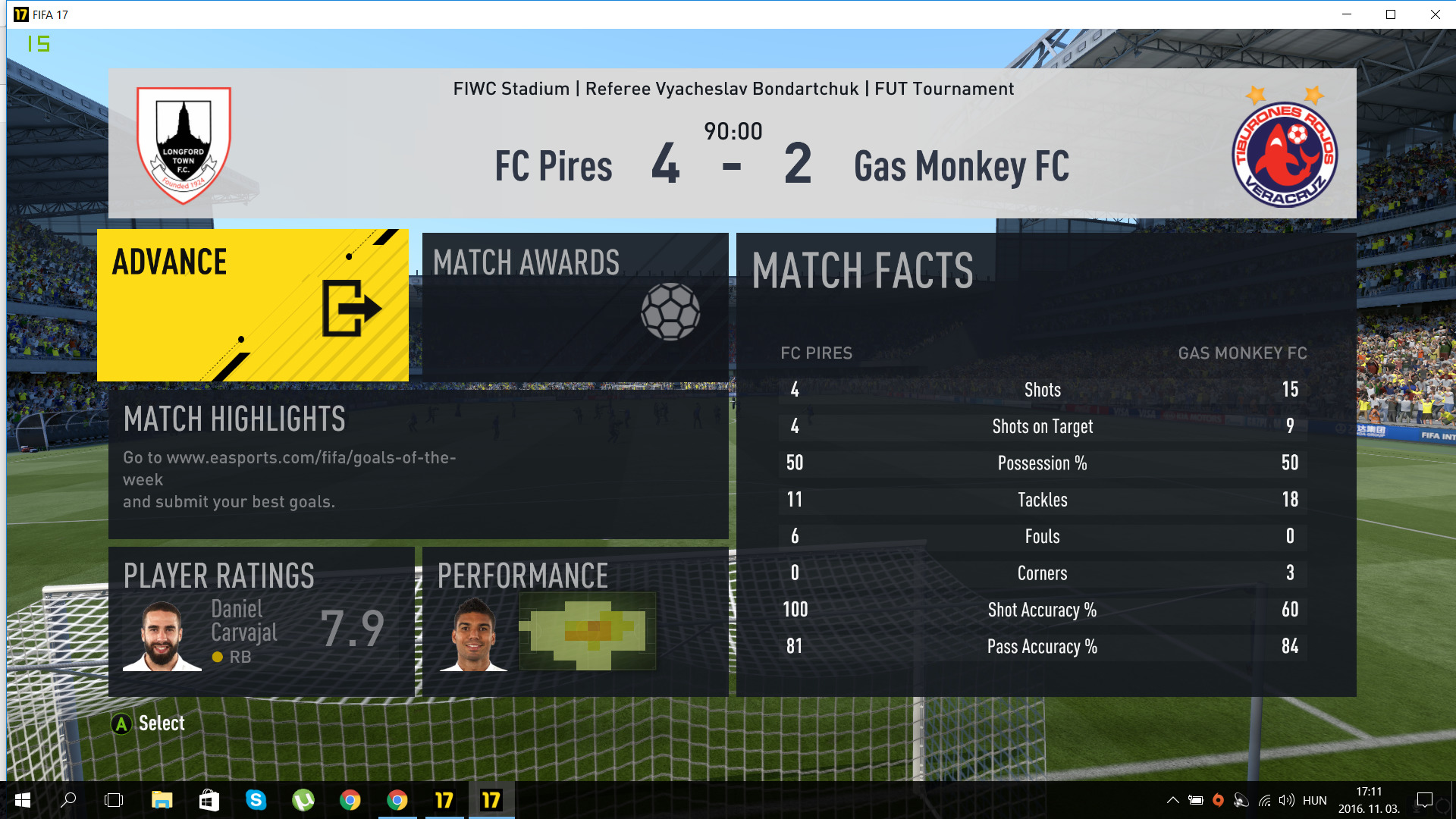 Hosszabbítás második félidejében ismét megszerzem a vezetést, és megint olyanok történnek hogy játékosom lába között átmegy a 0 erősségű ellenfél passza. Szerencsére már le tudtam védekezni a meccs hátralévő részét.
