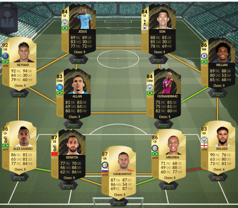 arra gondoltam, hogy eladom, és váltok erről erre. Allannal nem vagyok megelégedve a magassága miatt, többek közt ezért sem vettem még meg Nainggolant (ill. 170-80k-t egy 86-os arany lapért nem szívesen adok), de Neymarral csak így működne a dolog. SBC Promest is tervezem megcsinálni, nagyon korrekt lapnak tűnik, de amíg nem jön ki prime Zanetti, maximum csere lenne. Bonuccit és Van Bastent leszámítva gyakorlatilag október óta ez a kezdő, ezért váltanék, kérdés, megérné-e?