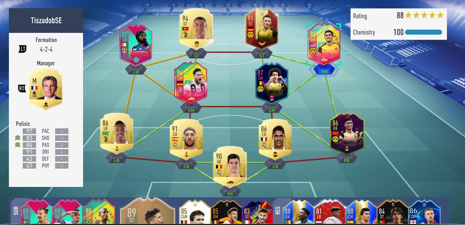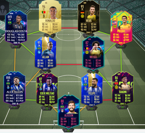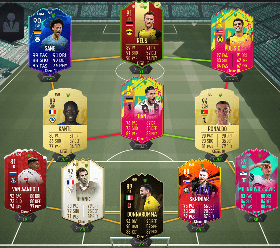 Ár/értékben állítom ez az egyik legjobb opció, mindenki full chemen tud létezni és baromi erős így együtt. Rebic, Poulsen elöl annyira fullos, hogy rájuk már engine-t érdemes tenni inkább hasonlóan CR-hez, mert az adja a legtöbb, legjobb statot. Szélen 5WF-es játékosok, rájuk is mehet az engine, ha meg lövés is kell akkor hawk. (bár Jovic engine lappal is 90+ shootingos, Nedved meg 80+ shootinggal is mindent bever, tapasztalat)