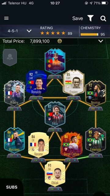 [link] Ezt talaltam most ki. 442 lenne ingame, Neymar, Werner csatar. Bal szelre kellene valaki. 800k coinom van. Abbol Neymar elvisz 550-et kb. Ronaldot ki tudom szerintem rakni a klubbol.