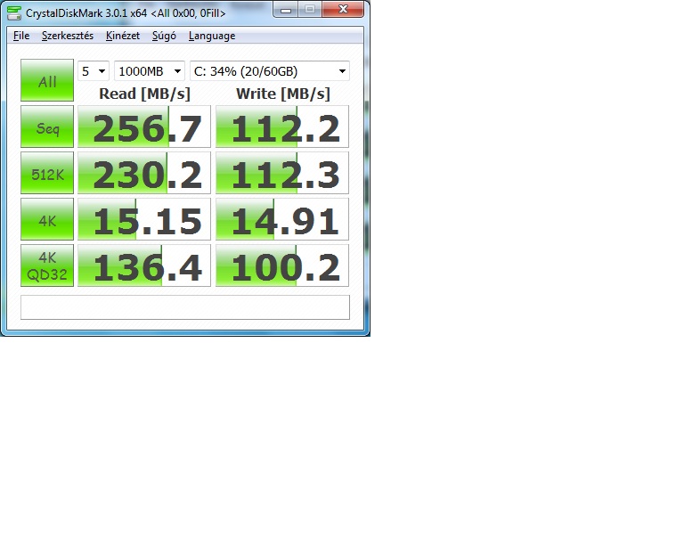 Ez akarhogy nezem meglehetosen gyatra. Igaz SATA II-n van, de ettol meg a sima HDD-m is gyorsabb. Win 7 is lassabban tolt be mint HDD-rol. BIOS-t frissitettem, mas otletem jelenleg nincs.