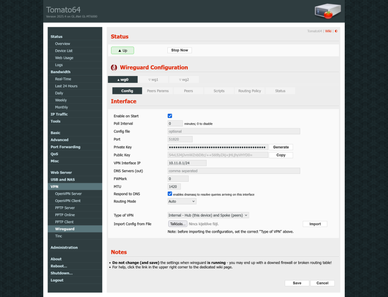Én meg úgy gondolom, hogy nem kéne. Vagyis persze kell, de ezt a rendszernek kellene megcsinálnia automatikusan, ahogy azt teszi OpenVPN esetében is, vagy a transmission, vagy a webes admin, vagy bármilyen más szolgáltatás WAN felőli elérése esetében. Egyik ilyen esetben sem kell nekem scriptelni, hanem a rendszer csinálja automatikusan a megadott port alapján. A másik dolog meg, hogy hiába teszem be ezeket a sorokat bárhova, akár az administration - script - firewall részbe, akár a Wireguard szerver PostUp Script részbe, sehol sem működik, csakis akkor jó, ha manuálisan futtatom le terminálban.