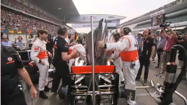 Hamilton autójával motorproblémák vannak, lehet, hogy a rajtrácsra sem tud felállni, most szerelik, még kb. 5 percük van rá.