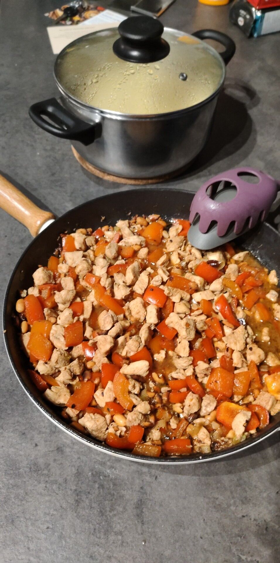 a húst felteszem rendesen sülni előmelegített serpenyőben, kevés olivaolajjal, rá a borsot, amikor fehéredik, rárakom a zöldségeket, összekeverem, majd pár perc után, amikor a zöldségek is kezdenek átlényegülni, egy deci vizet öntök rá, ezután forralom/párolom (kinek mi) pár percig, majd ráborítom a mogyorót, meg az őrölt gyömbért, apropó, fűszerek, külön nem sózom, mert a mogyi és a szója is sós + a vége előtt egy perccel 1-2 ek szezámolajat ízlés szerint.barilla spagettivel tálalom.