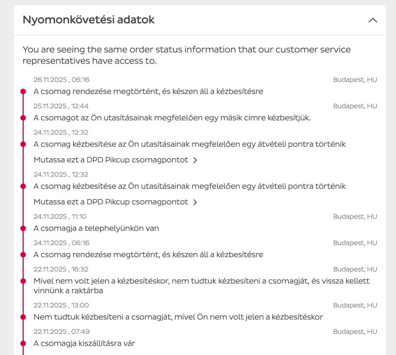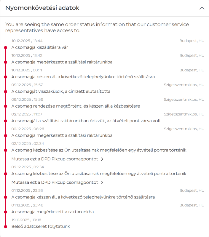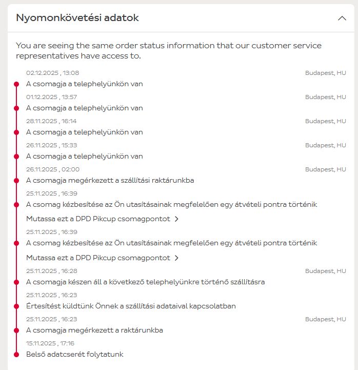 Mindjárt még mi leszünk a hisztisek. Még november 13.-án rendeltem egy csomagot Aliról, nem nagy 3pár (4+2) fülhallgató illeszték meg 1 kábel, tenyérnyi méretű cucc kb. amit 19.-én fel is vett a DPD az adatbázisába. December 1.-én jött az üzenet és a nyomkövetési frissítés, hogy megérkezett a raktárukba, ekkor módosítottam Box-ba a kiszállítást, mert az a tuti... Másnap, 2.-án a kiszállítási depóba került SzSzMiklósra, még aznap "az átvételi pont zárva volt" de készen áll a csomag a kézbesítésre... Eltelik 1 hét míg nem történik semmi, írtam emailt neki, hogy valami információ estleg? Erre 9.-én "csomagját visszaküldik, a címzett elutasította". Erre megint írok nekik, hogy nem utasítottam el semmit, várom a csomagom...