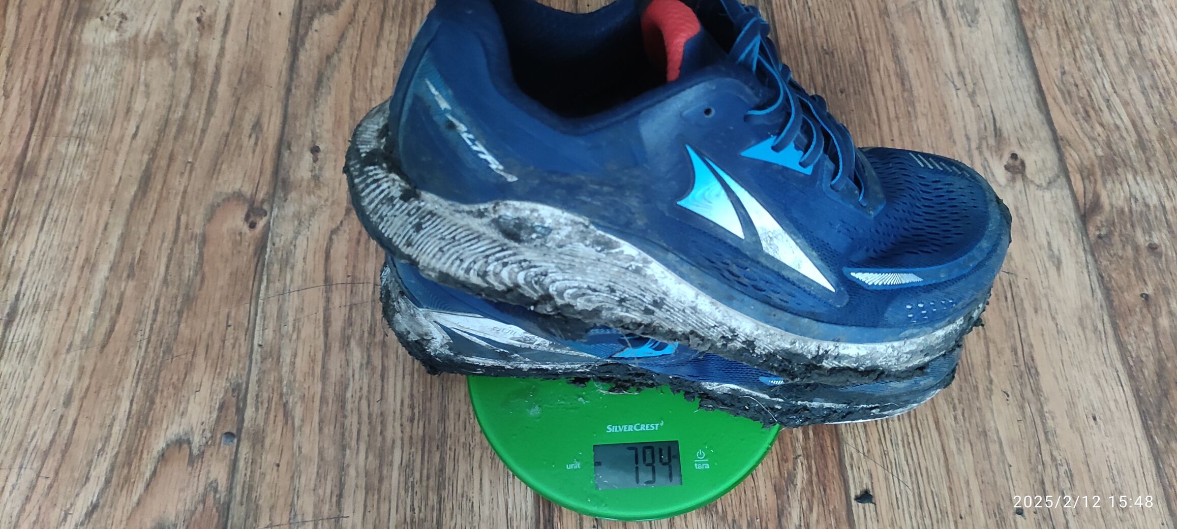 Az Altra Paradigm 6 került a lábra, hazaérve lemértem... Amikor már ~2 kilométert aszfalton lötyögtem benne. Kicsit meghízott, jobban mondva itt már a lecsoffadt saras verzió látható.